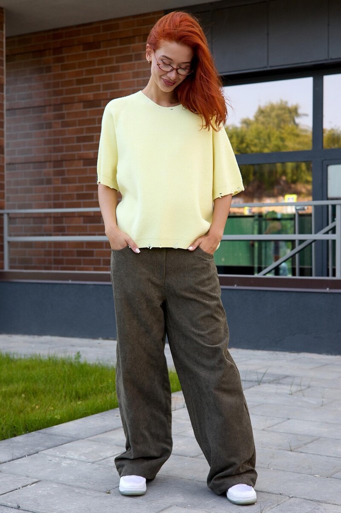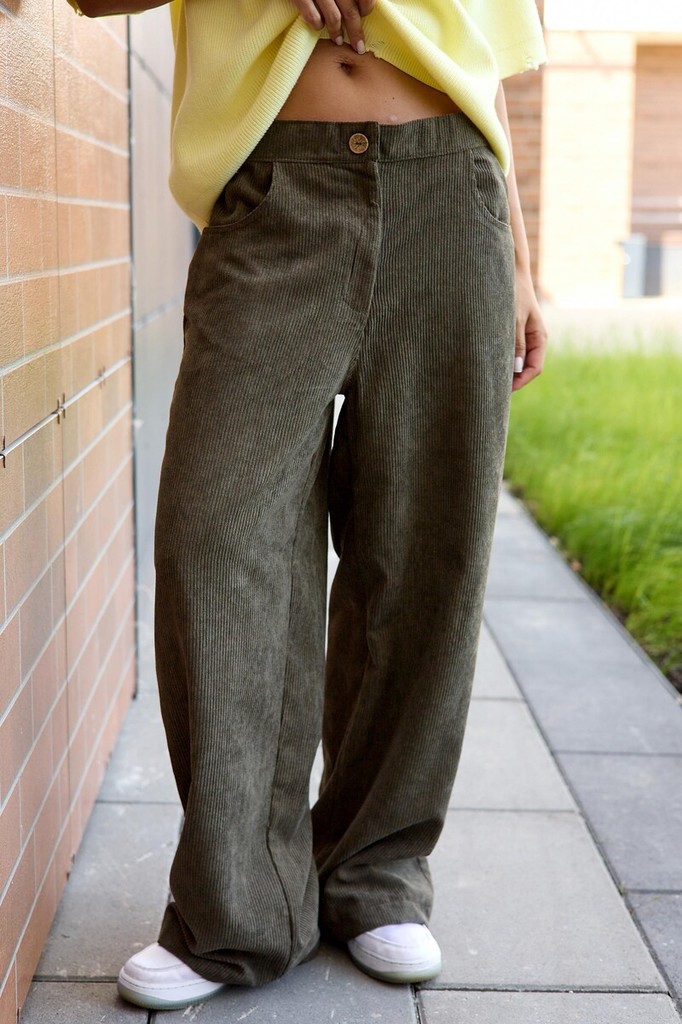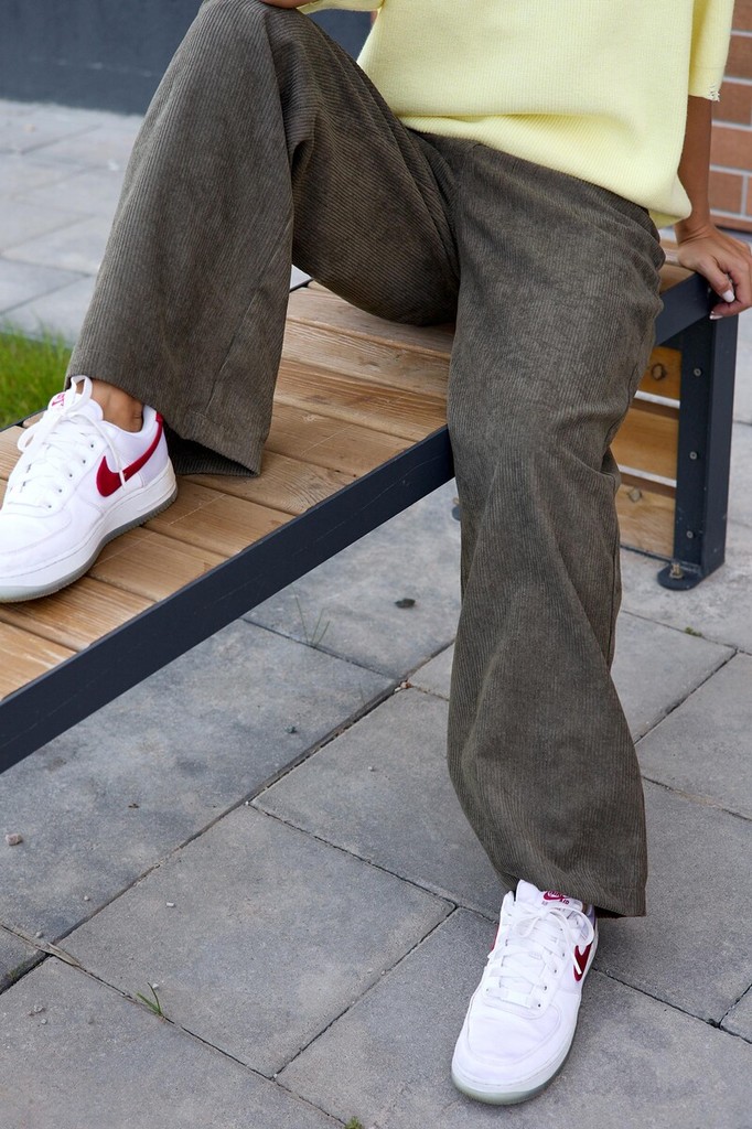 Ткань: микровельвет. Состав: 65% п/э, 30% вискоза, 5% эластан. Цвет: хаки. Карманы: в боковых швах брюк. Длина готового изделия брюки с учетом резинки: 44/ 93 см, 46/ 93 см, 48/ 93 см, 50/ 94 см, 52/ ... Показать описание94 см, 54/ 94 см. Рост модели: 168 см. Брюки с высокой посадкой, талия на широкой резинке. В боковых швах есть карманы. Такой костюм идеален для создания повседневного образа современной девушки. По низу брюки декорированы защипами. Уход за изделием: ручная стирка до 30 градусов; нельзя отбеливать; деликатный отжим; гладить при t не более 110 С; гладить с изнанки. *Допуск отклонения длины при массовом производстве 1-3 см является нормой.