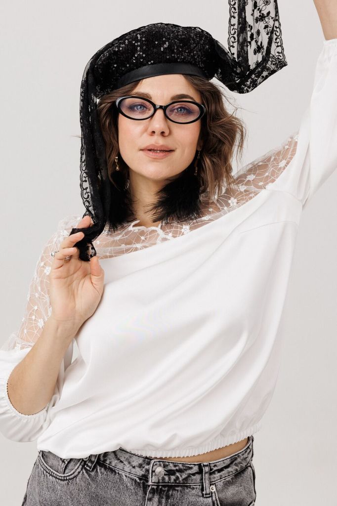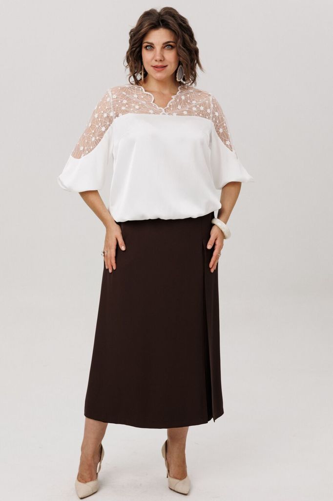Состав: Вискоза-65%; ПЭ-32%; Спандекс-3%; Сезон: Осень-Зима Рост: 164 Страна бренда: Беларусь Состав: Вискоза-65%; ПЭ-32%; Спандекс-3%; Эта блуза - воплощение изящной женственности и воздушного очаров... Показать описаниеания. Её свободный, струящийся силуэт мягко обволакивает фигуру, даря ощущение лёгкости и невесомости. Фигурный вырез горловины плавными линиями подчёркивает красоту линий, добавляя образу утончённости. Верхняя часть, словно лёгкое кружевное облако с изысканными кокетками на полочке, спинке и изящными вставками на рукавах, переходит в благородный гладкий атлас, мерцающий приглушённым блеском. Рукава три четверти, собранные у низа на тонкую резинку, и такой же аккуратный низ самой блузы создают мягкие, едва уловимые волны, добавляя образу воздушности и динамики. Эта вещь от Анелли -  искусное сочетание романтичного кружева и мягкого сияния атласа, которое способно превратить любой день в маленькое событие. Она станет идеальным спутником как для светского праздника, так и для тёплого корпоративного вечера, где царят красота и элегантность. На модели в блузе цвета «фарфоровое кружево» шикарные юбка-брюки 1783 и пушистый жакет 1661. Состав 2 (кружево): полиэстер 95% спандекс 5%; Замеры: Размер 48: ОГ-110; ОТ-113; ОБ резинка растянута -116; ОП-40; ДИ-61; ДР-47; Размер 50: ОГ-114; ОТ-117; ОБ резинка растянута - 120; ОП-42; ДИ-61; ДР-46; Размер 52: ОГ-118; ОТ-121; ОБ резинка растянута - 124; ОП-42; ДИ-62; ДР-47; Размер 54: ОГ-122; ОТ-125; ОБ резинка растянута - 128; ОП-44; ДИ-62; ДР-46; Размер 56: ОГ-126; ОТ-129; ОБ резинка растянута - 132; ОП-44; ДИ-63; ДР-46; Размер 58: ОГ-132; ОТ-135; ОБ резинка растянута - 138; ОП-46; ДИ-64; ДР-46; Размер 60: ОГ-136; ОТ-139; ОБ резинка растянута - 142; ОП-46; ДИ-65; ДР-47; Размер 62: ОГ-140; ОТ-143; ОБ резинка растянута - 146; ОП-48; ДИ-65; ДР-46;