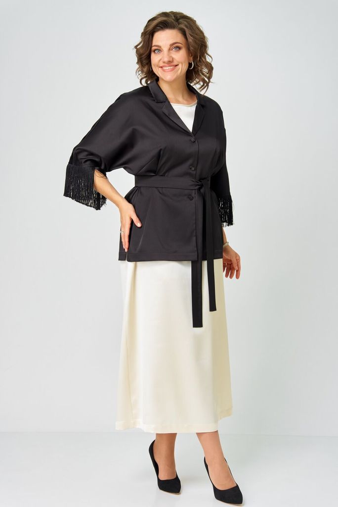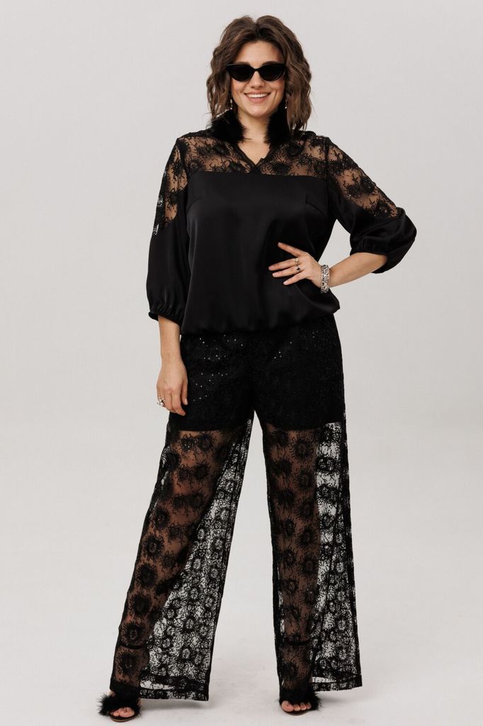 Состав: Вискоза-65%; ПЭ-32%; Спандекс-3%; Сезон: Осень-Зима Рост: 164 Страна бренда: Беларусь Состав: Вискоза-65%; ПЭ-32%; Спандекс-3%; Эта блуза — воплощение изящной женственности и воздушного очаров... Показать описаниеания. Её свободный, струящийся силуэт мягко обволакивает фигуру, даря ощущение лёгкости и невесомости. Фигурный вырез горловины плавными линиями подчёркивает красоту линий, добавляя образу утончённости. Верхняя часть, словно лёгкое кружевное облако с изысканными кокетками на полочке, спинке и изящными вставками на рукавах, переходит в благородный гладкий атлас, мерцающий приглушённым блеском. Рукава три четверти, собранные у низа на тонкую резинку, и такой же аккуратный низ самой блузы создают мягкие, едва уловимые волны, добавляя образу воздушности и динамики. Эта вещь от Анелли -  искусное сочетание романтичного кружева и мягкого сияния атласа, которое способно превратить любой день в маленькое событие. Она станет идеальным спутником как для светского праздника, так и для тёплого корпоративного вечера, где царят красота и элегантность. На модели шикарные брюки 1804. Состав 2 (кружево): полиэстер 95% спандекс 5%; Замеры: Размер 48: ОГ-110; ОТ-113; ОБ резинка растянута -116; ОП-40; ДИ-61; ДР-47; Размер 50: ОГ-114; ОТ-117; ОБ резинка растянута - 120; ОП-42; ДИ-61; ДР-46; Размер 52: ОГ-118; ОТ-121; ОБ резинка растянута - 124; ОП-42; ДИ-62; ДР-47; Размер 54: ОГ-122; ОТ-125; ОБ резинка растянута - 128; ОП-44; ДИ-62; ДР-46; Размер 56: ОГ-126; ОТ-129; ОБ резинка растянута - 132; ОП-44; ДИ-63; ДР-46; Размер 58: ОГ-132; ОТ-135; ОБ резинка растянута - 138; ОП-46; ДИ-64; ДР-46; Размер 60: ОГ-136; ОТ-139; ОБ резинка растянута - 142; ОП-46; ДИ-65; ДР-47; Размер 62: ОГ-140; ОТ-143; ОБ резинка растянута - 146; ОП-48; ДИ-65; ДР-46