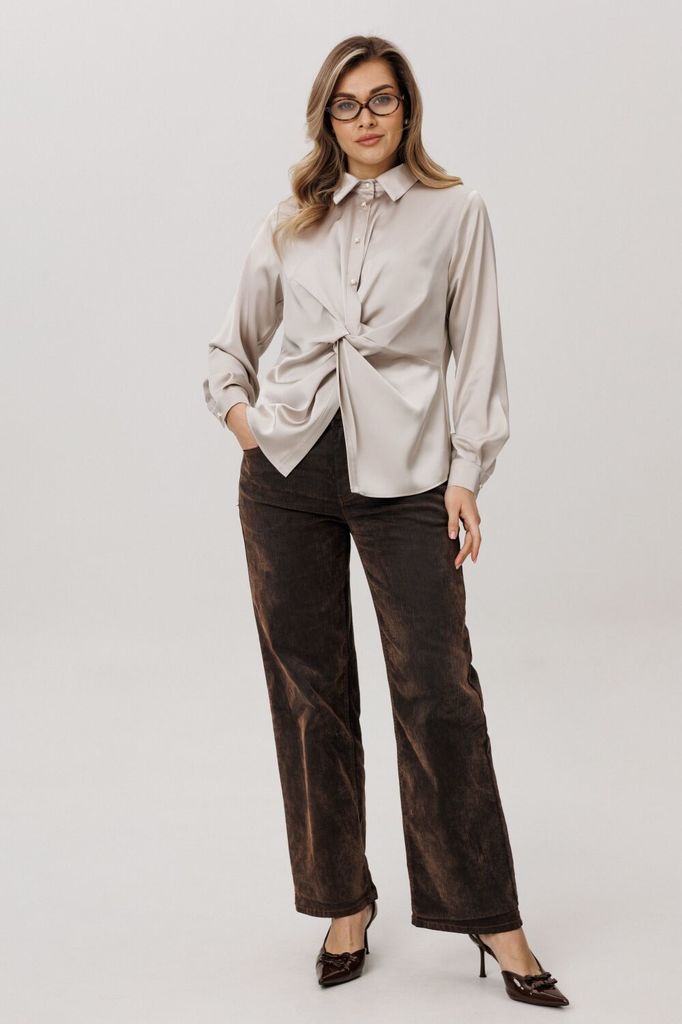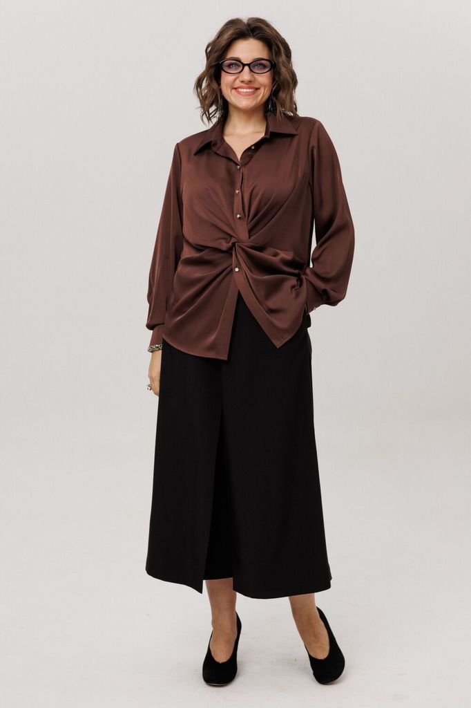 Состав: Вискоза-65%; ПЭ-32%; Спандекс-3%; Сезон: Осень-Зима Рост: 164 Страна бренда: Беларусь Состав: Вискоза-65%; ПЭ-32%; Спандекс-3%; Эта блуза от Анелли - настоящее искусство, воплощенное в нежной,... Показать описание струящейся ткани, которая ласкает кожу шелковистым сиянием Настоящая магия начинается прямо над линией талии, где рождается виртуозная драпировка. Ткань, послушная и пластичная, изящно перекручивается, формируя мягкий, объемный узел из живописных складок. Этот элемент не просто украшение - это скульптурный акцент, который притягивает взгляды, подчеркивает талию и придает всему силуэту уникальный, динамичный характер. Детали довершают образ безупречного качества: строгий отложной воротник на стойке, длинные рукава, заканчивающиеся элегантными манжетами на пуговицу, и аккуратная застежка на петли и пуговицы на притачной планке. Блуза создана для того, чтобы даже самый обычный день наполнился ощущением особенного стиля и утонченной женственности. На моделе в блузе цвета «айс брауни» юбка-кюлоты 1787. Замеры: Размер 48: ОГ-106; ОТ-102; ОБ-114; ОП-40; ДИ-63; ДР-61; Размер 50: ОГ-110; ОТ-106; ОБ-118; ОП-41; ДИ-63; ДР-62; Размер 52: ОГ-114; ОТ-110; ОБ-122; ОП-42; ДИ-64; ДР-62; Размер 54: ОГ-120; ОТ-116; ОБ-128; ОП-44; ДИ-64; ДР-62; Размер 56: ОГ-124; ОТ-120; ОБ-132; ОП-45; ДИ-65; ДР-62; Размер 58: ОГ-128; ОТ-124; ОБ-136; ОП-45; ДИ-66; ДР-62;