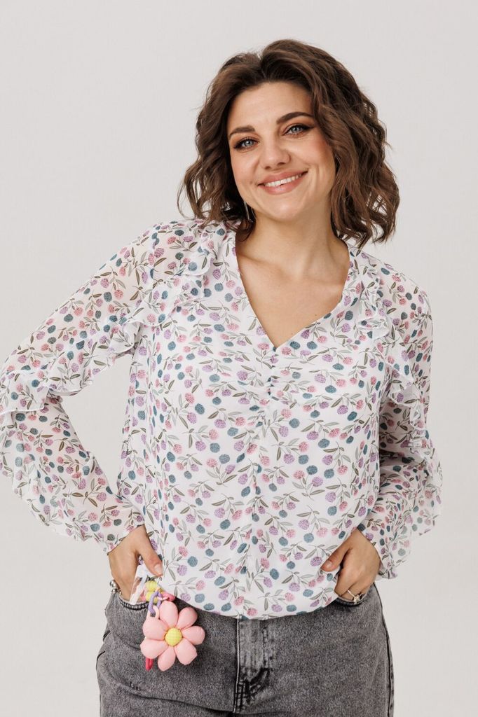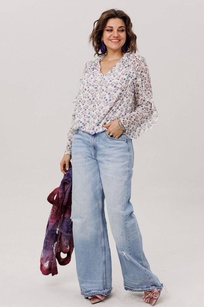 Состав: ПЭ-40%; Хлопок-60%; Сезон: Весна Рост: 164 Страна бренда: Беларусь Состав: ПЭ-40%; Хлопок-60%; Нежная и лёгкая блуза «батерфляй», созданная для повседневных образов с мягким романтическим наст... Показать описаниероением. Свободный крой дарит ощущение комфорта и естественной лёгкости, а V-образный вырез дополняется изящной шнуровкой, которую можно обвязать вокруг шеи или оставить свободно ниспадать, меняя настроение образа и добавляя ему индивидуальности. Длинные рукава с манжетами и мягкими воланами придают силуэту воздушность и деликатную женственность, создавая лёгкое движение при каждом жесте. Ассиметричная линия низа с небольшими разрезами делает блузу пластичной и комфортной, она красиво ложится по фигуре и легко сочетается как с джинсами, так и с юбкой. Особое очарование модели придаёт выразительный принт с бабочками - нежный, живой и очень красивый, он наполняет образ лёгкостью и мягкой романтикой. Эта блуза отАнелли создана для каждого дня, когда хочется выглядеть мило, женственно и чувствовать себя естественно красивой. Замеры: Размер 46: ОГ-110; ОБ-110; ОП-40; ДИ спинки - 68; ДР-63; ДИ переда - 67; Размер 48: ОГ-114; ОБ-114; ОП-42; ДИ спинки - 68; ДР-63; ДИ переда - 67; Размер 50: ОГ-118; ОБ-118; ОП-42; ДИ спинки - 69; ДР-63; ДИ переда - 68; Размер 52: ОГ-122; ОБ-122; ОП-44; ДИ спинки - 70; ДР-63; ДИ переда - 69; Размер 54: ОГ-126; ОБ-126; ОП-44; ДИ спинки - 69; ДР-63; ДИ переда - 68;