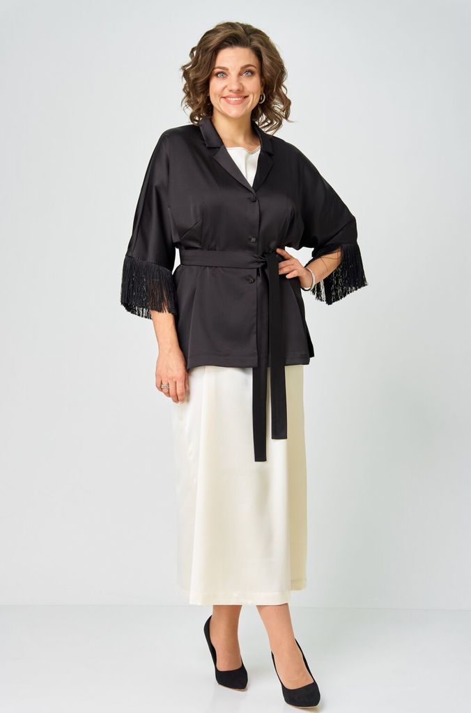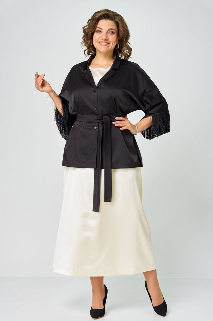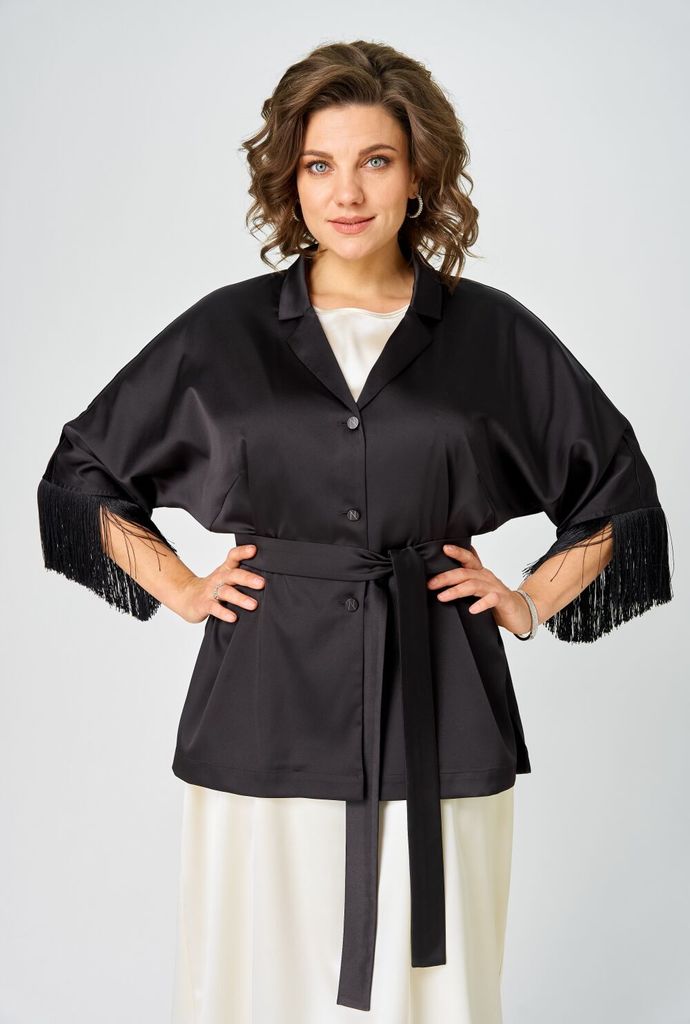 Состав: ПЭ-100%; Сезон: Весна Рост: 170 Страна бренда: Беларусь Состав: ПЭ-100%; Блузка кимоно для женщин – это идеальный вечерний наряд, который добавит шарма и элегантности вашему образу. Она сочета... Показать описаниеет в себе стиль кимоно с классическими чертами жакета за счёт формы горловины и воротника. Пояс, входящий в комплект, позволяет акцентировать талию и придать блузке дополнительный шик. Свободный крой придает ей особую изысканность, а бахрома по низу рукавов делает еще более эффектной. Эта модная и стильная блузка кимоно подойдет для различных мероприятий, она необычайно универсальна и легко вписывается в любую ситуацию. Таблица измерений изделия в готовом виде М 5050 Наименование измерений/размер  50 52 54 56 58 60 Ширина по линии груди блузка 62 64 66 68 70 72 Ширина по линии бёдер блузка 61 63 65 67 69 71 Длина блузки 70 70 70 70 70 70 Длина рукава от горловины (с бахромой) 46(58) 46(58) 46(58) 46(58) 46(58) 46(58) Допустимые отклонения +-1-1,5 см