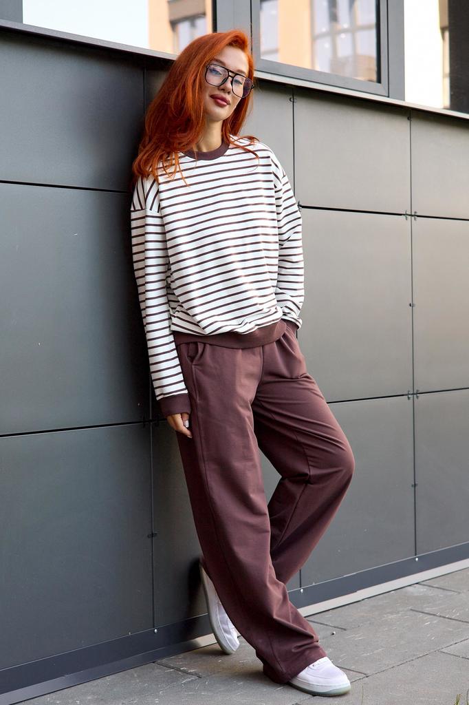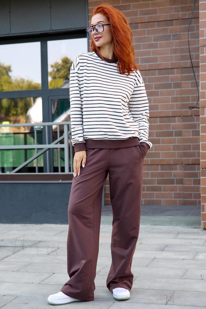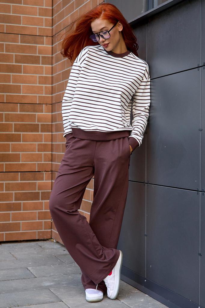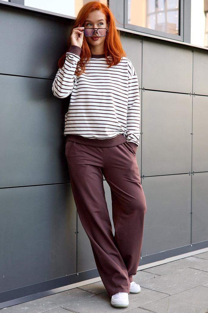 Представляем вашему вниманию новинку - костюм "Полоса". Модель представляет собой комфортное и стильное решение для женщин, предпочитающих комфорт и удобство в повседневной одежде. Мягкий трикотаж обе... Показать описаниеспечивает идеальную посадку, комфорт и легкость ношения. Свитшот - тельняшка и однотонные брюки создают гармоничный образ, подчеркивая фигуру. Брюки прямого кроя, с боковыми карманами, резинкой на талии и боковой вставкой ввиде лампаса из этой же ткани, что зрительно вытягивает силуэт и выгодно усложняет образ. Лонгслив свободного кроя, рукав спущен, отделка из ткани-компаньона цвета брюк. Костюм "Полоса" прекрасно подходит для дома, занятий спортом или прогулок на свежем воздухе. Высокое содержание хлопка гарантирует отличную воздухопроницаемость и приятные ощущения при носке. * Артикул: 10575 * Состав Хлопок 95%, Эластан 5% * ГОСТ 31409-2009 * Цвет Коричневый * Изготовитель ИП Вартанян Марина Валерьевна * Торговая марка Lika Dress * Тип ткани Футер 2-х нитка * Для кого для женщин * Плотность ткани Средняя * Уход Машинная стирка * Карманы В боковом шве * Комплектность Лонгслив/Брюки * ТН ВЭД 6104299000