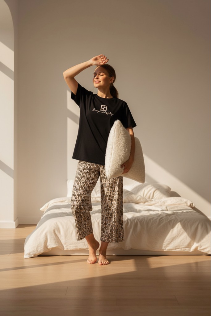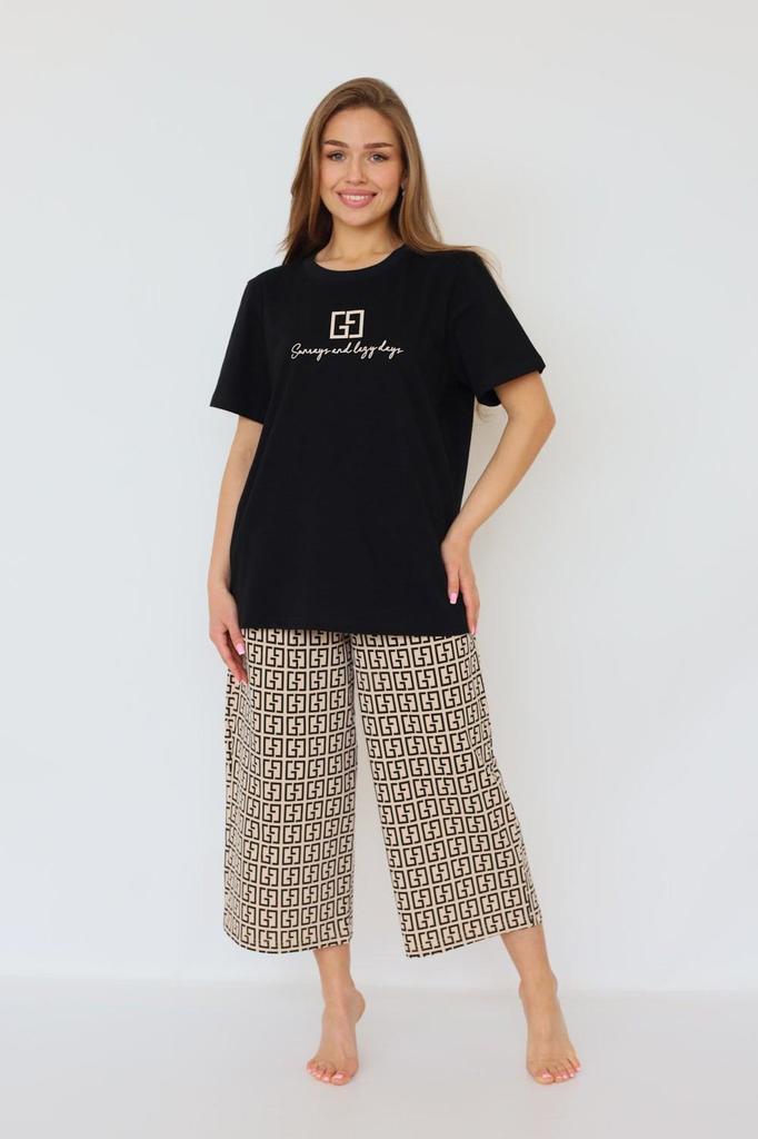 Женская пижама из 100% хлопка — идеальный вариант для комфортного сна и уютного отдыха дома. Натуральная ткань мягкая, дышащая и приятная к телу, подходит для повседневного использования в любое время... Показать описание года. Модель выполнена в удобном свободном силуэте, не сковывает движений и обеспечивает максимальный комфорт. Брюки-кюлоты на мягкой резинке, без карманов, удобно сидят по фигуре и не создают лишнего объёма. Кофта застёгивается на пуговицы, что делает пижаму практичной и комфортной в носке, а рукав длиной 3/4 обеспечивает удобство и свободу движений. Пижама отлично подходит не только для сна, но и в качестве стильного и уютного домашнего костюма. Модель представлена в широком размерном ряду и выполнена в трендовых расцветках с актуальными принтами, благодаря чему станет прекрасным подарком для родных и близких — практичным, красивым и по-настоящему комфортным. * Артикул: 10061 * Состав Хлопок 100% * ГОСТ 31409-2009 * Цвет Черный/Бежевый * Изготовитель ИП Вартанян Марина Валерьевна * Торговая марка Lika Dress * Тип ткани Кулирка * Для кого для женщин * Комплектность Футболка / бриджы * ТН ВЭД 6104192000