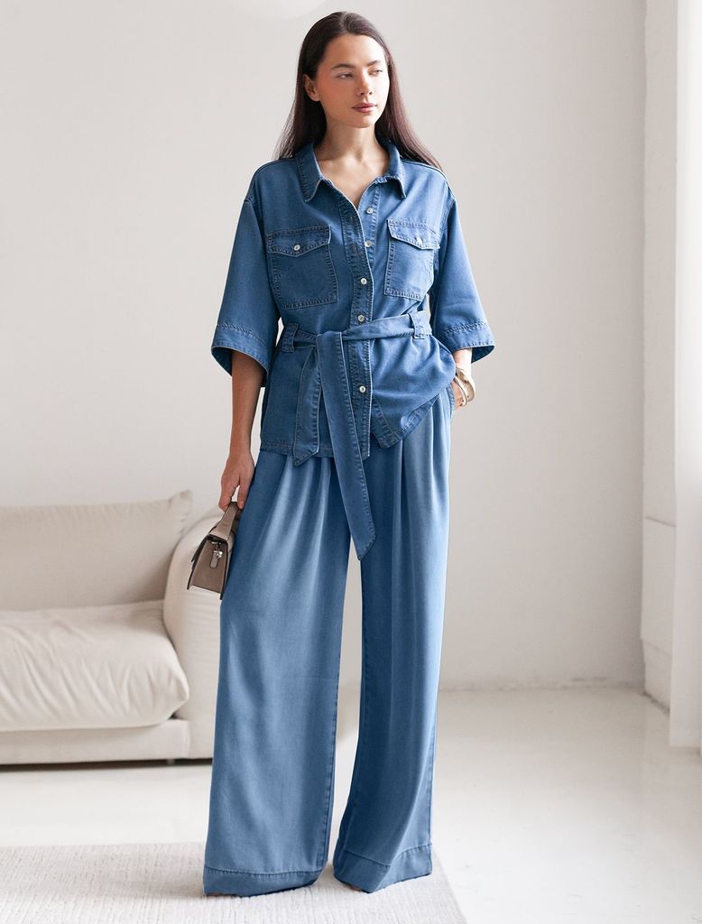 Состав: 70%Лиоцелл (Вис) 20%ПЭ 10%Вис Плотность: 7,8 OZ Эффектная удлиненная блузка светло-синего цвета с поясом выполнена из джинсового лиоцелла плотностью 7,8 OZ.. Универсальная модель идеально подходит для повседневной носки, пояс подчеркивает талию и скрывает небольшие недостатки фигуры, сохраняя при этом стильный вид. Отложной воротник создает аккуратный внешний образ, придавая классической рубашке элегантность. На груди расположены карманы, которые добавляют практичности. Ткань сочетает прочность и мягкость лиоцелла с вискозой, что делает её невероятно комфортной, дышащей, устойчивой к сминанию и идеально подходящей для чувствительной кожи. Благодаря нежным тактильным ощущениям, будто шелк, от которого ощущается приятная прохлада, рубашка отлично подходит для создания легких летних образов или стильных ансамблей на каждый день засчет своей универсальности. Широкий рукав средней длины гарантирует свободу движений и удобство на весь день. Джинсовую блузку можно сочетать в стиле кэжуал, а также создавать монохромные образы или добавлять яркие акценты с помощью аксессуаров. Эта джинсовая рубашка на пуговицах станет базовым элементом гардероба для тех, кто ценит сочетание классики, моды и удобства. Рекомендуем сочетать с артикулами: D54.257, D56.127, D54.239